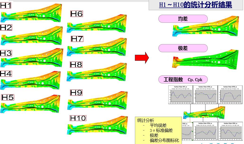 例如拉延件,修邊,沖孔,翻邊,整形等,首先各個(gè)工序件與本身工序加工數(shù)型做對比分析,查看模具與本工序零件的變形干涉情況,后一工序的加工數(shù)據(jù)對比分析查看其不同,通過兩個(gè)數(shù)據(jù)比對分析,可有有效的分析出當(dāng)工序零件在此工序時(shí)候的變形問題。所有工序零件還需要跟最終產(chǎn)品做對比分析查看其變化趨勢,分析出哪一個(gè)工序是導(dǎo)致與產(chǎn)品設(shè)計(jì)不符的直接原因。