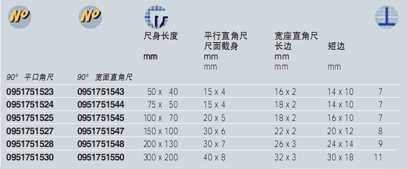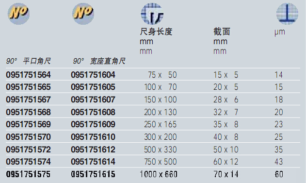 | 訂貨號(hào) 90o平行直角尺 | 尺寸長度 mm | 截面 mm | 允許垂直度誤差 μm |